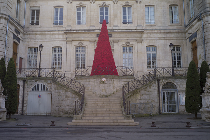 I drove to the town of Apt, which is a 15 minute drive from Bonnieux, just to get a feel for it since it is the biggest little town nearby. A town that is charming on some days, and tired and brooding on others, but most lively and engaging on Saturdays when the market comes to town. Today it was a dreary old place until I turned a corner and came upon the Marie, their city hall, and there it was! The Tree, in all its formality, poised like the rising tree in Balanchine’s The Nutcracker.