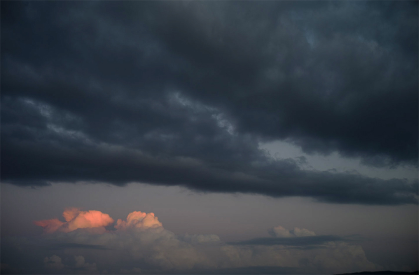Just sitting at a friend’s dinner table watching the oncoming dusk slowly draining the light of the day. A long meditation on change. Light, gliding from the fullness of white clouds to the saturated last licks of color at their tops, and then, right before my eyes, it’s gone, like a magician showing his trick and we not being able to see it – that’s magic! Not seeing the change while looking at it.