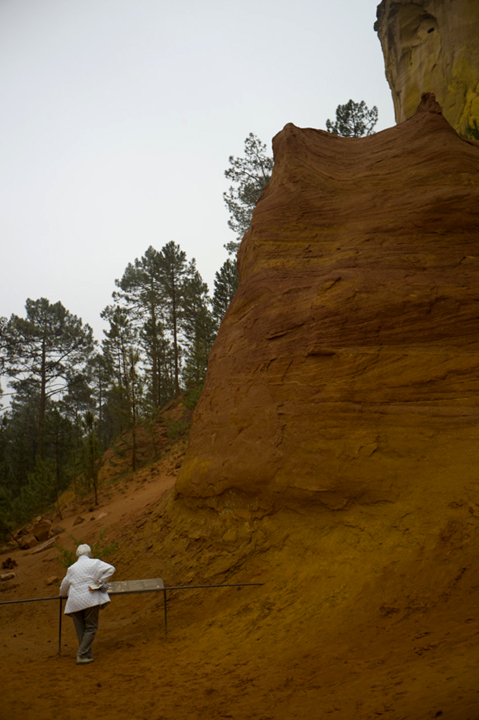 Near Bonnieux there is a town called Rousillion, famed for the red clay cliffs left there millions of years ago when the seas retreated. We decided to show our Italian friends a little local color, which, even on a grey day, is surprisingly intense. The place has a scale to it that always thrills me and makes me pay attention to the little things, could be just the small gesture of the woman reading the text and the way she carries her weight.