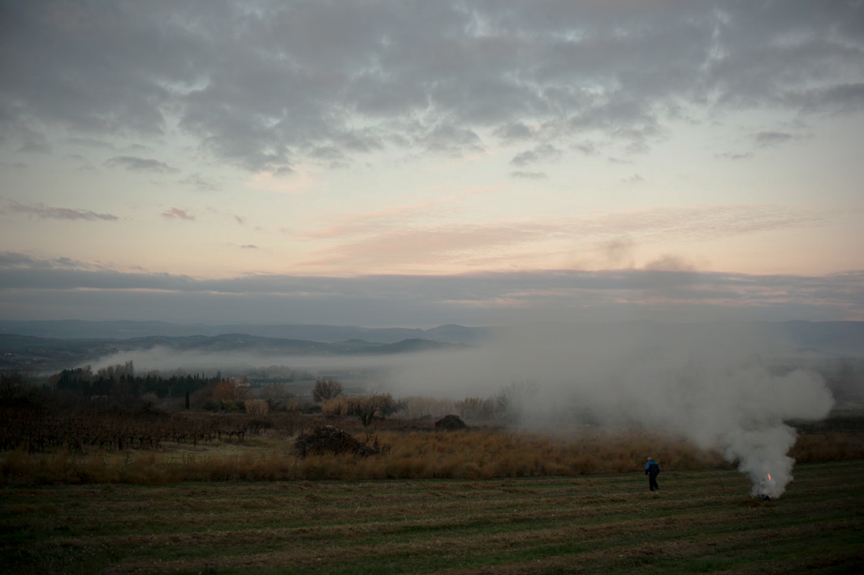 December in Provence is when the farmers and vineyard workers burn the cuttings from the harvest. Smoke signals rise everywhere in solemn flags of grey, wafting wherever breeze or cool air convection draws them, often mingling with other pyres in the valley and laying down a screen of fragrant mist.