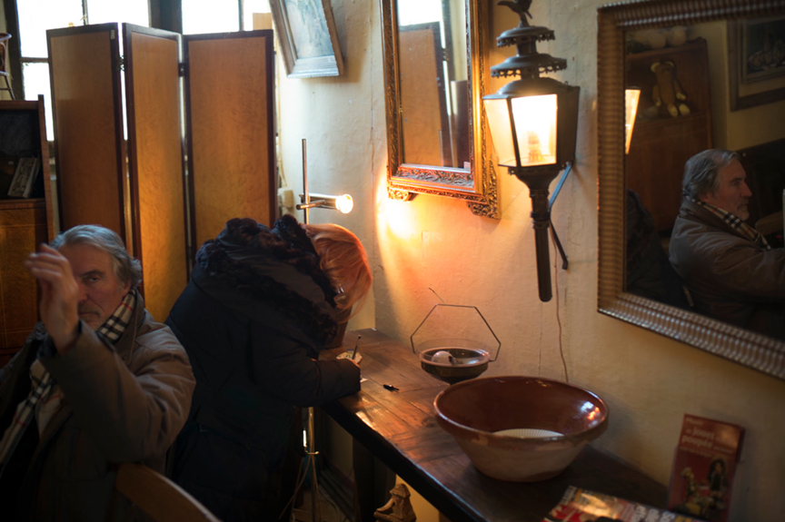 Antique fair, stuff everywhere, and too much to look at, and then out of the corner of my eye I get a sense that something – meaningless maybe – but a slight ambiguity, which came from a sliver of a moment when I wasn’t sure of what I was seeing, the light, the red hair, the coat engulfing, the 2 faced portrait, the gesture non gesture. Everything that was there in just that second, and nothing.