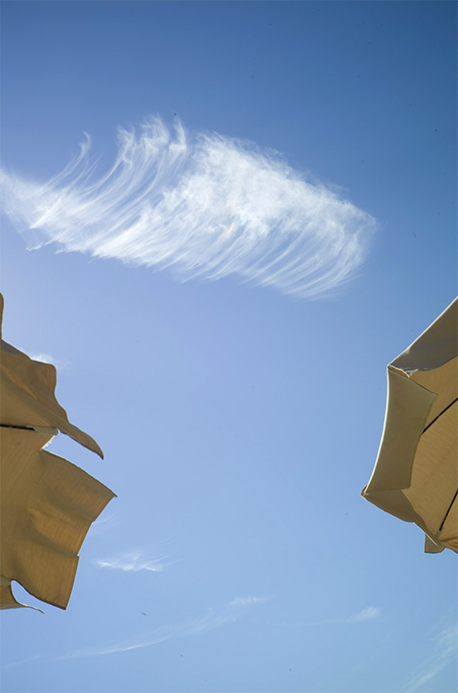 Here, I was lying on a beach lounge, and when I looked up the combed cloud was gliding across the space between the 2 half seen umbrellas. Had I not been lying down exactly where I was my point of view would not have contained this thought.